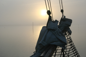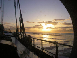 Donderdag in Harlingen opstappers opgepikt, en vrijdag kwamen de laatsten aan boord om over het wad richting Duitsland te scharrelen. eerst naar het Oosterom gezeild, daar voor anker en vervolgens op zeil naar Ameland. Van Ameland naar het Lutjewad, en daar drooggevallen. Dinsdag gingen de meeste opstappers in de Eemshaven van boord. De hele week hebben we prachtig weer gehad (wel koud). Door de IJslandse as was de lucht ook nog eens streeploos blauw. Op dinsdag sloeg het weer om; bewolkt, harde WNW wind (6 vlagen 7) Door het late tij hadden we nog voldoende tijd en water om van de Eemshaven door te varen naar Norderney.