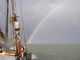 Weer in Nederland! Op het moment dat ik dit schrijf varen we Noordpolderzijl voorbij.De terugreis... wel voorspoedig, maar toch ook een beetje raar verlopen. Het begon met de vervroegde thuisreis van Gijs. Hij vertrok – wegens privé omstandigheden – vrijdag; zijn trein kruiste die van Marion en Jitske ergens halverwege Duitsland. Gelukkig heeft Marion haar vaarbevoegdheid, waardoor we dus niet op stel en sprong een vervangende maat nodig hadden. Vervolgens besloten we vanwege de weersvooruitzichten een dag vroeger (zondag) al uit Holtenau te vertrekken. Daarna kregen we dat verhaal op Helgoland. Gelukkig waren we op tijd op het wad, want de hele week heeft het hard gewaaid, en vaak geregend. Heel veel regenbogen hebben we de afgelopen week mogen aanschouwen.